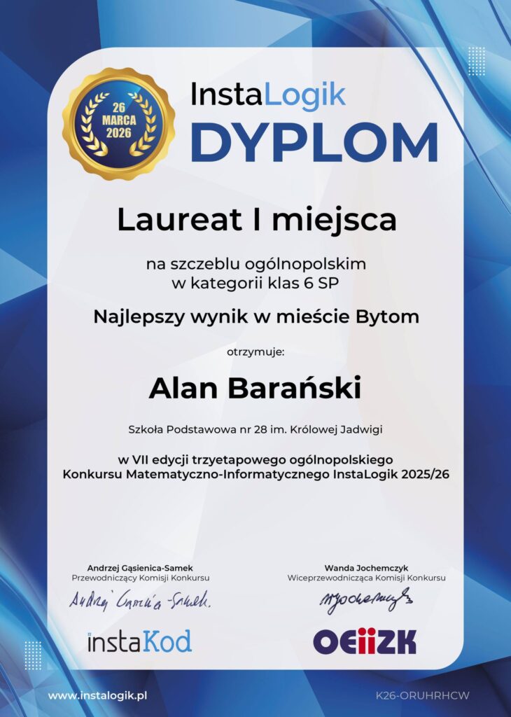 ALAN BARAŃSKI – uczeń klasy VI a odniósł wielki sukces zdobywając tytuł laureata na szczeblu ogólnopolskim w kategorii klas szóstych w konkursie InstaLogik. Alan uzyskał też najlepszy wynik w mieście w swojej kategorii. Gratulujemy serdecznie!